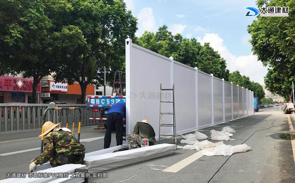 深圳市大通建材PVC施工圍擋的圍墻板采用PVC長條版拼接而成,立柱、橫管均為PVC材料,內(nèi)部均襯方通。立柱底板為鋼板,并加斜撐受力,更安全穩(wěn)固。