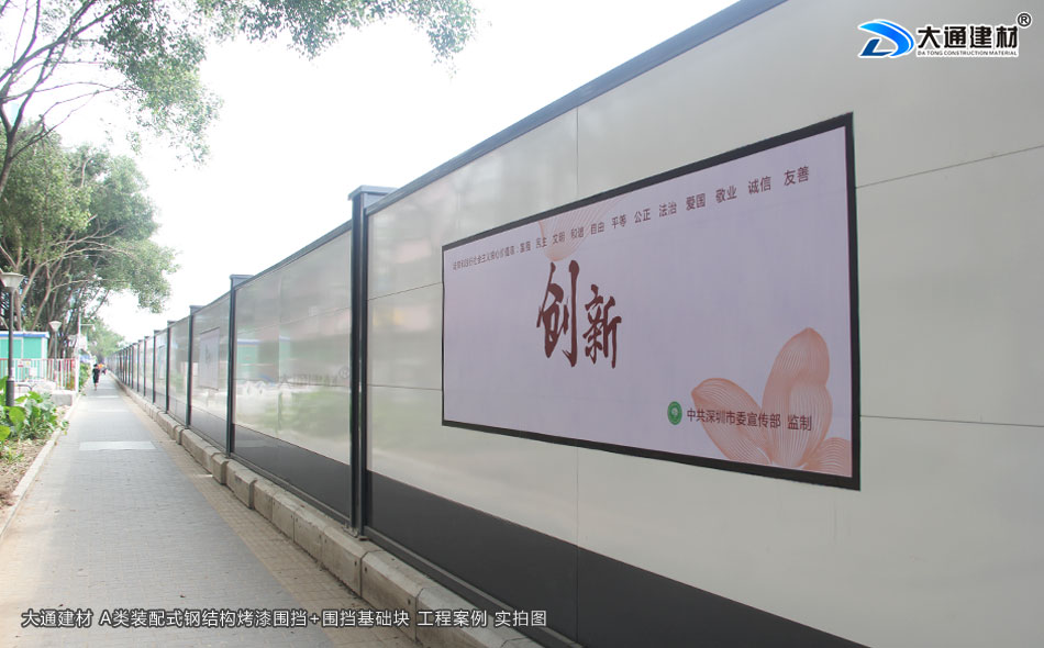 大通建材A類裝配式鋼圍擋,堅持深圳質量,關注城市美學,培育精益求精的工匠精神,結合深圳開放、創新、現代、濱海的城市的特征和公益宣傳的要求。提供具備不同區域環境特點的外觀設計方案,外觀顏色可以是白色+深灰色烤漆擋板(亦可是全白色烤漆擋板),美觀大氣的現代風格;再結合城市區域特點,分片區、分道路、分街景各自選用同類風格圍擋,營造美觀、整潔的城市環境的同時,實現圍擋風格區域性的協調統一。