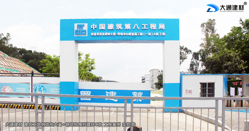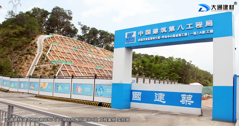 一般來說建筑工地大門是施工企業向社會大眾展示的企業形象,體現了企業的風貌。中國建筑八局集團在深圳市龍崗區蛇嶺大道坪地中心路道路工程(一期)A段的工程項目,選用了深圳市大通建材生產的鋼結構工地大門為項目部大門。