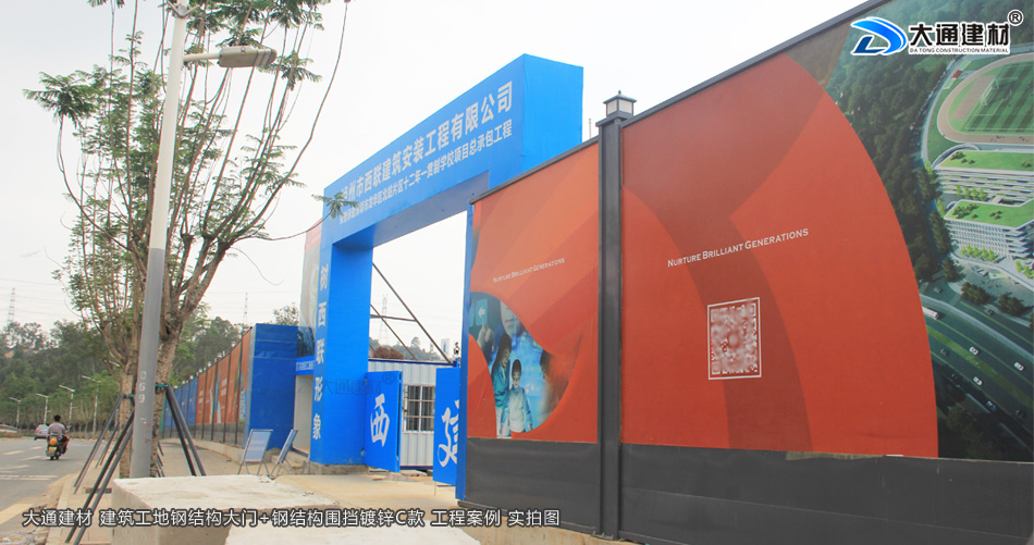瀘州市西聯建筑安裝工程有限公司在深圳市龍華區北站片區學校項目工程,選用了深圳市大通建材生產的鋼結構工地大門為項目部大門。